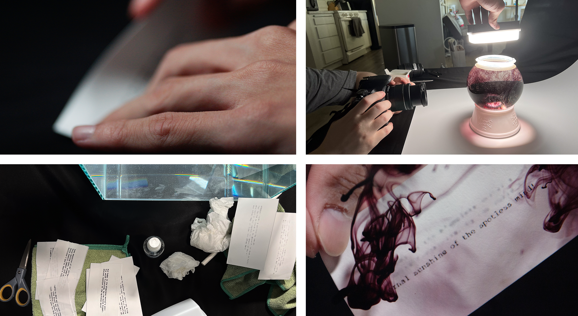 Fragments from the poem are printed, submerged, and filmed as they fall apart. Ink lifts off the page and drifts into the water, just as the memory drifts away.