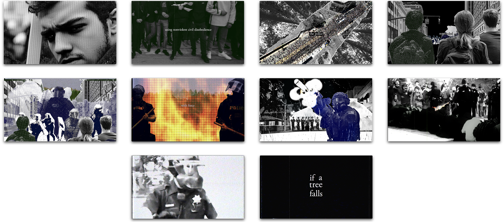 The goal of this project was to create a ~45 second teaser trailer for the film 'If a Tree Falls'. This piece focuses on the often violent conflicts between police and protesters the film ultimately revolves around.